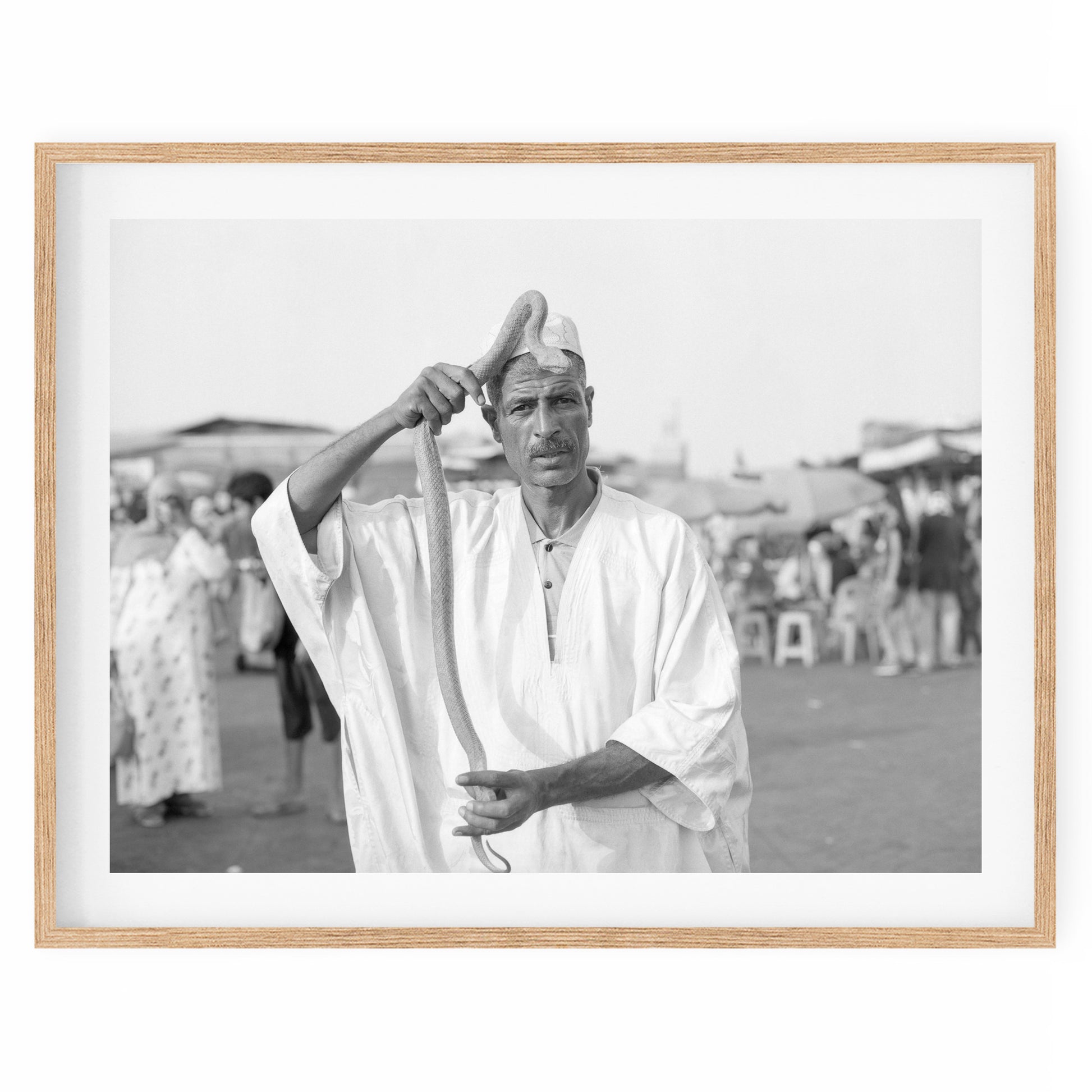 A portrait of snake charmer in the town centre, Morocco.